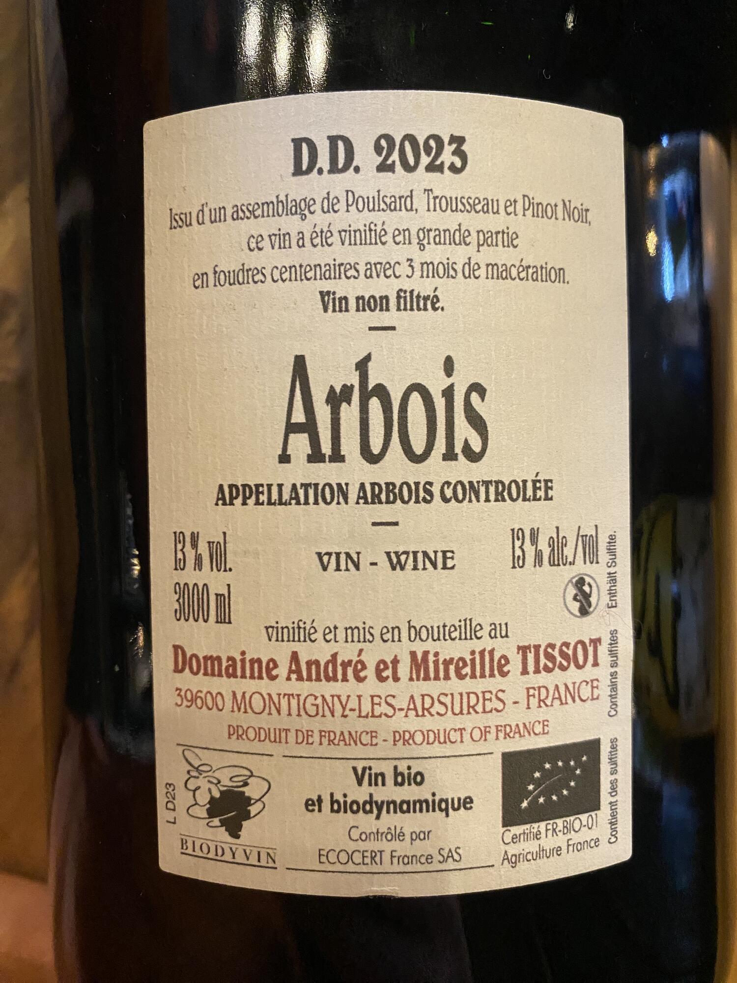 DD usually comprises of Pinot Noir, Trousseau, & Poulsard in equal parts. However in 2023 there was less Poulsard, so here we have around 15%. Stéphane never de-stems his Pinot, arguing that the skin of this variety is too delicate to rupture deliberately. All varieties are macerated for 3 months, the Poulsard and Trousseau with stems, and all in large old wooden tanks. Unfined and unfiltered, with approx. 5mg/L SO2 added at bottling.
